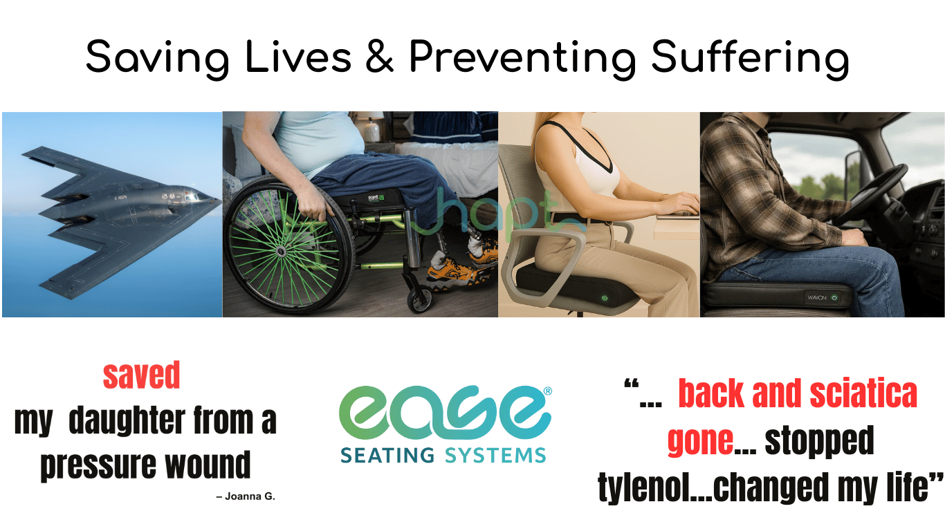 A quarter of a century's experience with wheelchair seating, our team's advanced innovation, and high-tech solutions in medical and military markets led to the creation of Horizontal Alternating Pressure Technology® (HAPT®) or the smart cushion -Ease Cushion®